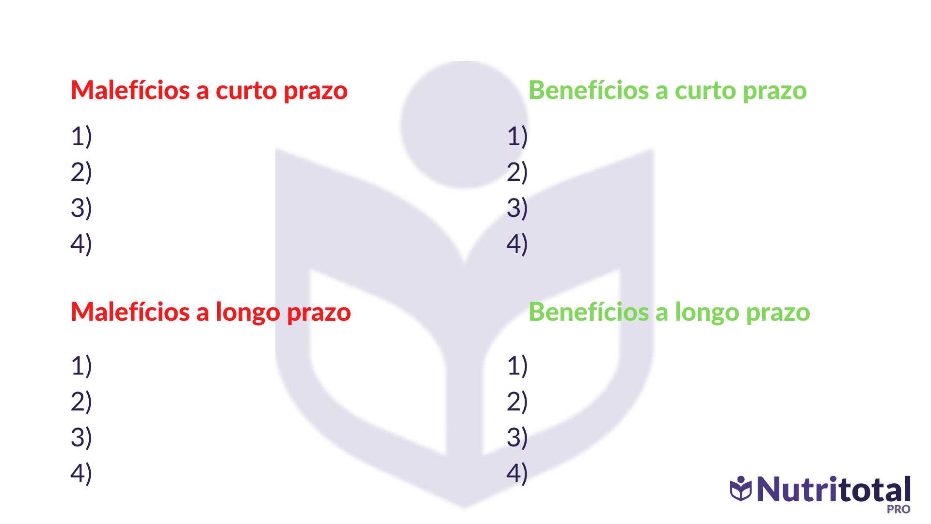 Usando uma folha de papel com o modelo abaixo, incentive-o a encontrar os benefícios e malefícios, a curto e longo prazo, de cada mudança identificada como necessária. Assim, o paciente poderá ter autonomia para saber se deseja ou não prosseguir.